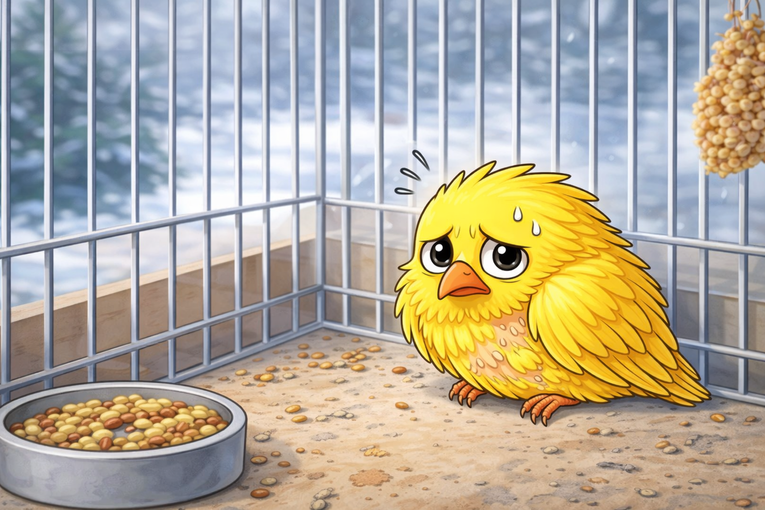 Soğuk ortamda bulunan kanaryalar, kafesin alt kısmında daha korunaklı bir alan arar. Cereyan, ani sıcaklık düşüşleri ve yetersiz ortam ısısı bu davranışı tetikler.